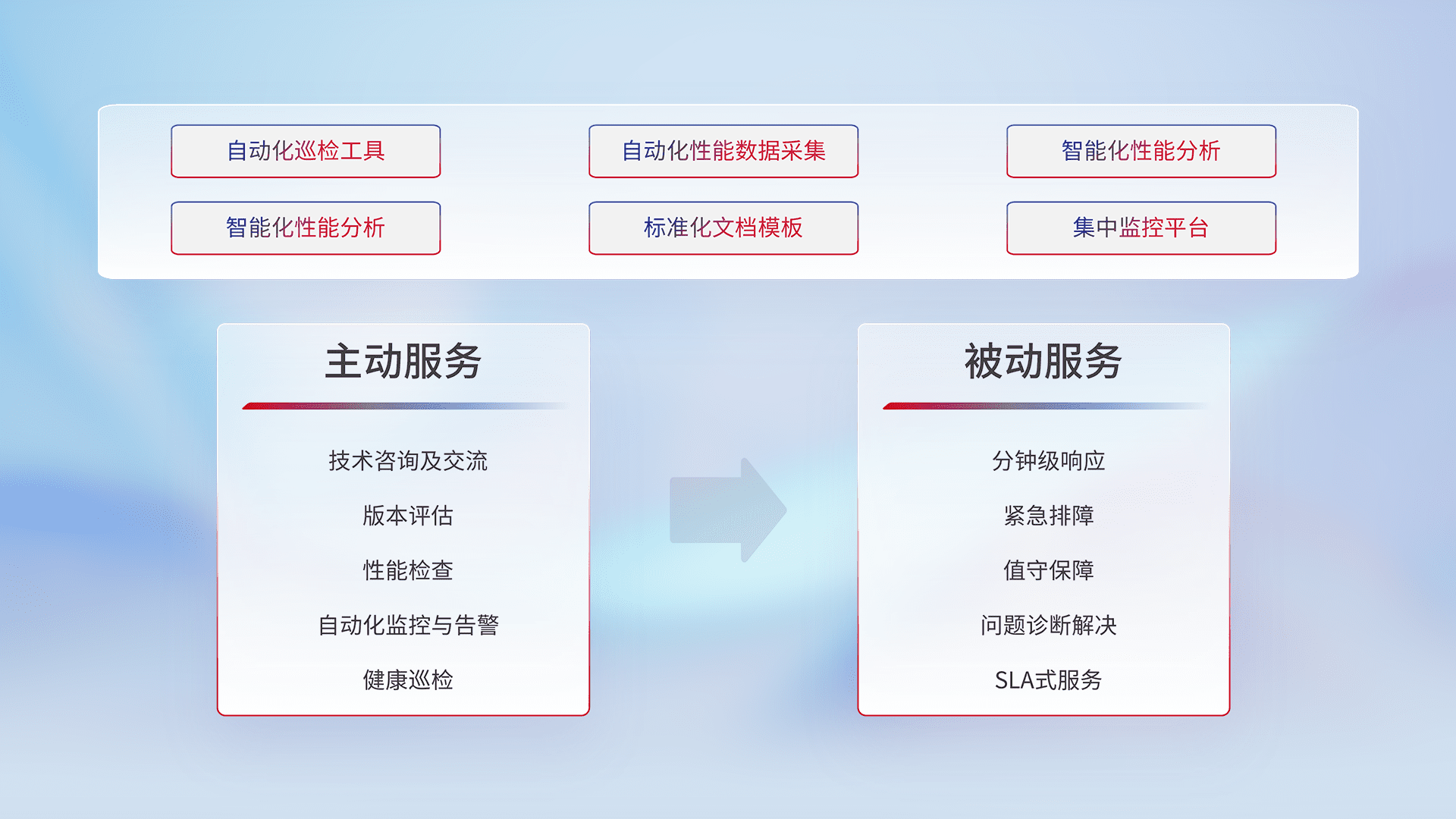 智能化工具和标准化文档,,,保障服务质量,,,提供主动服务(包含技术咨询、、、、版本评估、、、、性能检查、、、自动化监控与告警、、健康巡检)和被动服务包含(分钟级响应、、紧急排障、、、值守保障、、问题诊断解决、、、、SLA服务)。。。